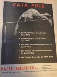 Within a year or two he met Herb Jenks who had just invented a new, as yet unnamed, pole. (Herb had previously invented the first fiberglass pole at Silo-flex, and then the Browning Skypole) He and my father formed a partnership (and lifelong friendship) and named the new pole Cata-pole. So my father’s company, Pacer, was the sole distributer for Cata-pole, and then the Catapole 550+ (the one banned in Munich).